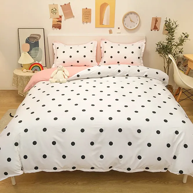 Дизайн. Юным модница придется по вкусу лаконичный бело-розовый комплект с узором горошек. Он смотрится нежно и мило в интерьере и создает уютную атмосферу в комнате девочки. Наволочки дополнены небольшим кантом, что также приходится очень в тему.