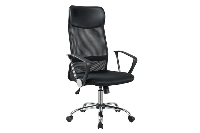 Рабочее кресло с высокой эргономичной спинкой и подлокотниками с алюминиевыми вставками. Основная часть обивки выполнена из искусственной кожи, а спинка — из сетки, которая отлично подстраивается под изгибы спины. Есть функция свободного качания, регулировка высоты, а также механизм постоянного контакта, благодаря которому спинка непрерывно поддерживает позвоночник сидящего.