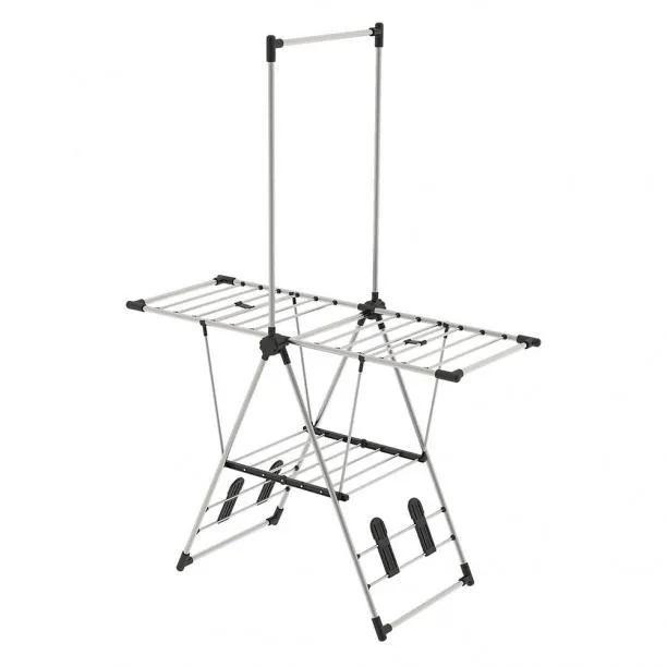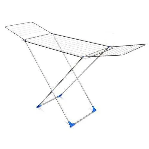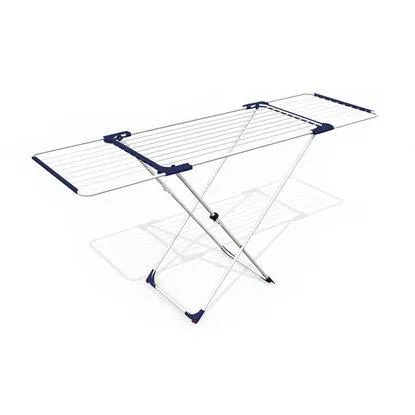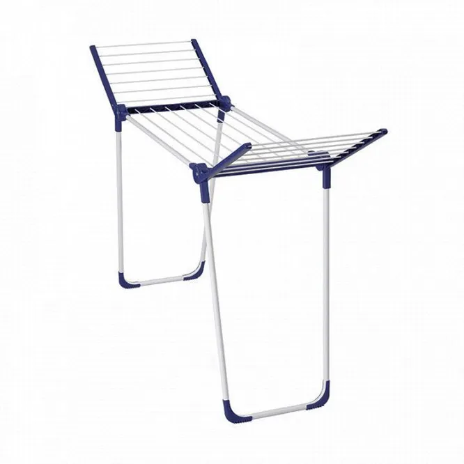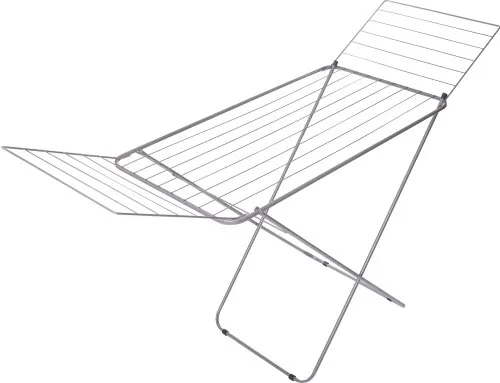 Эта модель сушилки включает основную рамку и два дополнительных откидывающихся крыла для размещения большего количества вещей. Она имеет очень простой раскладной механизм, позволяющий трансформировать ее одним движением. Во избежание появления ржавчины, металлические прутья покрыты слоем эмали. После процесса сушки эта модель складывается в тонкую конструкцию, которая помещается в шкафу или нише, не занимая много пространства. Ножки имеют мягкие резиновые насадки, защищающие полы и ковры от царапин и деформации. Ширина сушилки составляет 179,5 см – такие габариты позволяют с легкостью и удобством разместить на ней влажную одежду до полного высыхания.