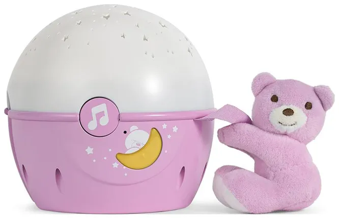 Эта игрушка предназначена для детей с рождения. Богатый выбор мелодий от классической до звуков природы поможет тебе уложить спать ребеночка вовремя. Проектор может светить мягким светом, а также показывать красивые звёзды, создавая на потолке ночное небо. Есть функция ночника, а игрушку-мишку можно отсоединить. Когда малыш начинает плакать, игрушка включается автоматически и начинает играть успокаивающая музыка.