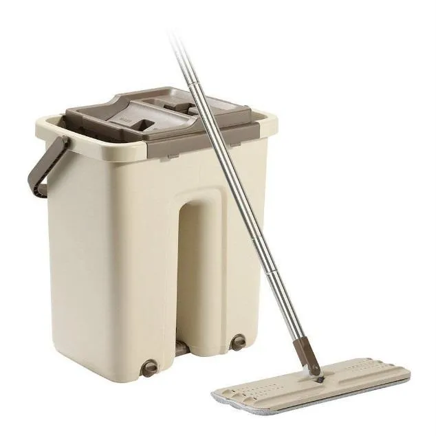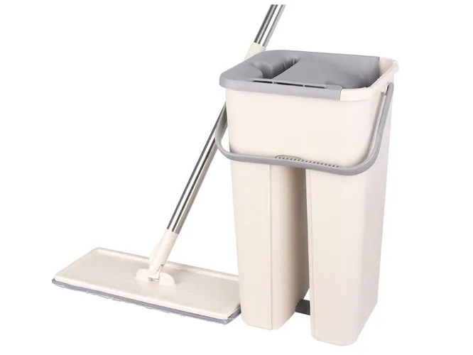 В этом наборе ведро состоит из 2 отсеков (для мытья и вертикального отжима). Если в горизонтальном ведре отжим происходит благодаря скручиванию, то здесь для этого нужно прижать швабру к борту отсека. Подобные швабры для мытья полов с отжимом считаются лучшими, если требуется вытереть пол насухо.