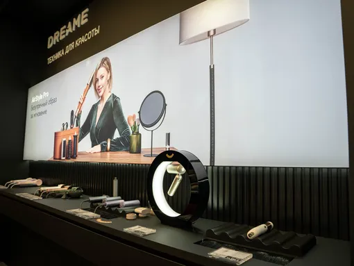 Ключевые особенности пространства: специальная звуковая комната для демонстрации телевизоров, зона с газонокосилкой в оформлении сада, лаунж-зона с кофемашиной и демо-стенд с роботом-пылесосом, способным преодолевать ступени. Отдельное внимание уделено большой бьюти-зоне с полной линейкой устройств для ухода за волосами.