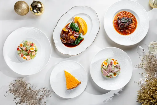 Шеф-повар Антон Луценко представил новогоднее меню, вдохновленное семейными традициями, теплыми воспоминаниями и знакомыми с детства вкусами. Оливье с копченой утиной грудкой подаётся в хрустящих шариках пани пури с красной икрой; холодец из говядины — со снегом из хрена, заливное из стерляди — в форме рыбок с лимоном, оливками и хреном. Неизменные гостьи праздника — мимоза с паровым лососем и печеными овощами и сельдь под шубой — также бережно переосмыслены шефом.