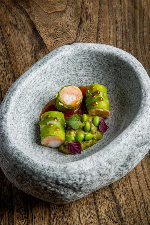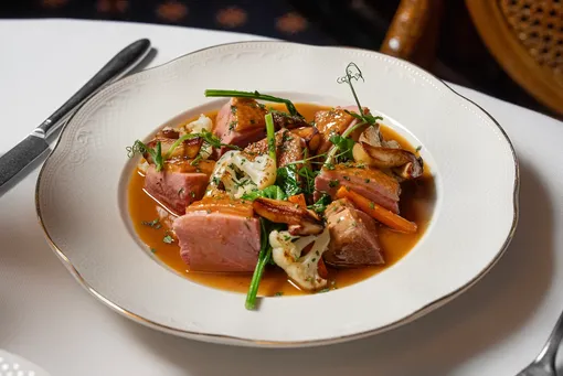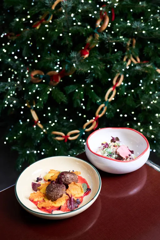 Шеф-повар Антон Луценко представил новогоднее меню, вдохновленное семейными традициями, теплыми воспоминаниями и знакомыми с детства вкусами. Оливье с копченой утиной грудкой подаётся в хрустящих шариках пани пури с красной икрой; холодец из говядины — со снегом из хрена, заливное из стерляди — в форме рыбок с лимоном, оливками и хреном. Неизменные гостьи праздника — мимоза с паровым лососем и печеными овощами и сельдь под шубой — также бережно переосмыслены шефом.
