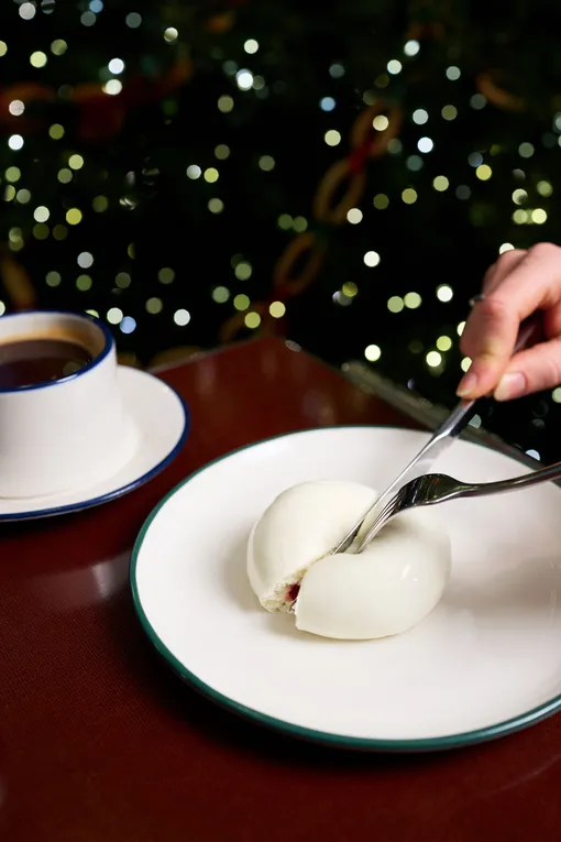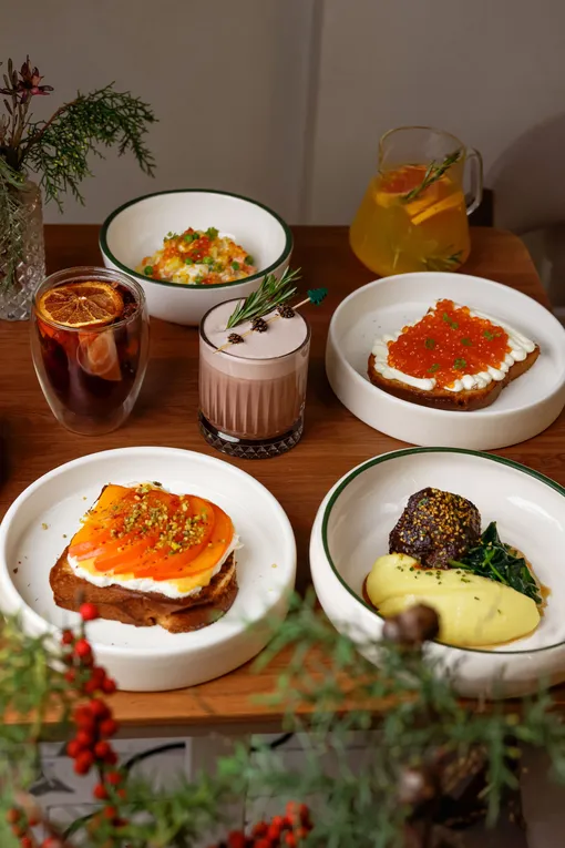 Завтрак оформлен как праздничный ритуал: драники и панкейки подают с красной икрой, риетом из лосося, взбитым маслом и двумя яйцами — сытно, нарядно и очень фотогенично. Главный герой витрины десертов это Matcha Christmas Tree: мини-торт в форме елки с муссом из матча, маракуйей, медовыми коржами и матча-кремом, украшенный золотыми акцентами и свечой-звездой для загадывания желаний. Также доступны бенто-торт «Медовик с клюквой» в индивидуальной упаковке со свечкой, подарочный бокс из веганских трюфелей собственного производства и макаронс с необычными зимними вкусами: «Имбирный пряник», «Глинтвейн» и «Тирамису ходжича».