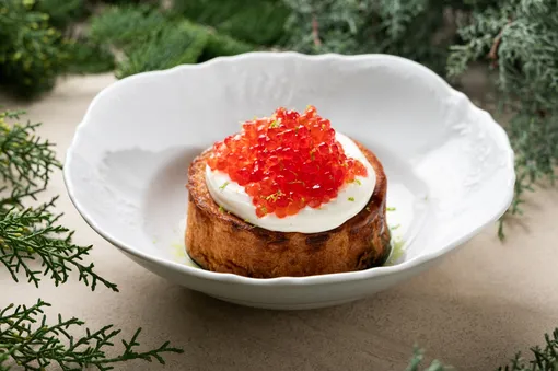 Для особенных встреч предлагают большой сет: ажурные домашние блины с икрой осетра, лосося и щуки со сметаной или ярусная этажерка оладий с разными видами икры и взбитым маслом. Также в меню — малосольные огурцы по бабушкиному рецепту. Главный салат — «оливье» с камчатским срабом. На закуску готовят тосты: с красной икрой и сметаной или с тремя видами икры. А на десерт шеф создал бархатный шоколадный мусс с брусничным соусом, украшенный съедобными снежинками.
