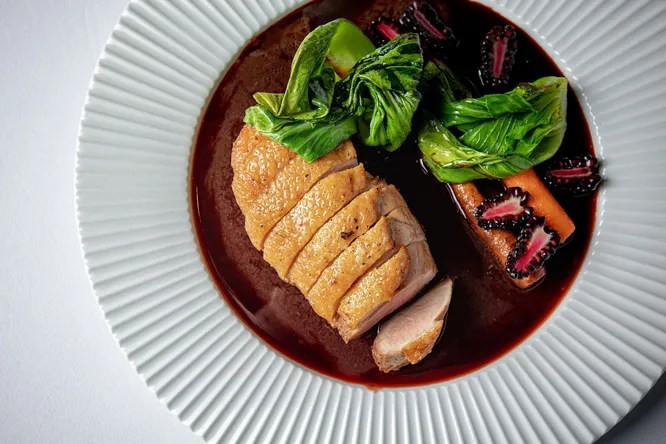 В начале трапезы стоит взять свежее и очень весеннее тирадито по-сицилийски с лососем, сибасом, красной креветкой и манго в цитрусовой заправке. Также нельзя не отметить классический Нисуаз с тунцом и легкий салат из красных креветок со стручковым горохом и имбирным соусом, исключительно фотогеничный. На горячее предлагают говяжью вырезку россини с фуа-гра, трюфелем и картофельным пюре, а также утиную грудку с ежевичным соусом (на обложке статьи) и ножку утки с апельсиновым соусом. Любителям пасты приготовят букатини алла аматричано с томатным соусом и беконом или сардинскую фреголу с морепродуктами. Для тех, кто ищет ошеломительно насыщенные вкусы — паппарделле с рагу из козленка и черным трюфелем в тосканском стиле.