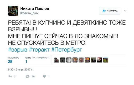 Поддавшись всеобщей панике, жители северной столицы стали сообщать в соцсетях о других взрывах. К примеру, один из пользователей Twitter заявил, что ему сообщили о взрывах на станциях «Купчино» и «Девяткино». Однако подтверждения этому нет.