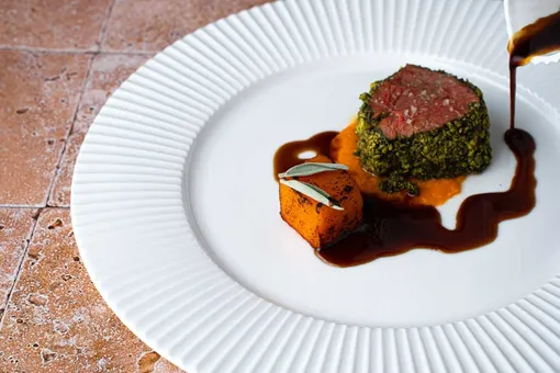 Суп тоже есть: стоит попробовать бульон из фермерских кур с мисо и подпеченным корнеплодами (еще в нем тортеллини с начинкой из цыпленка, древесные грибы, шпинат и соус сальса-верде — целое меню в одном блюде!). В разделе горячего особого внимания стоят сибас с роскошным морским соусом буйабес и икрой из жженого баклажана в средиземноморском стиле, пирог из ягненка в тесте бризе, томленый кролик с морковкой конфи и грильяжем из тыквенных семечек, и, конечно, стейк денвер с демиглясом и тонкой ноткой шалфея на сливочном масле.