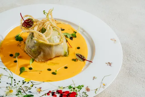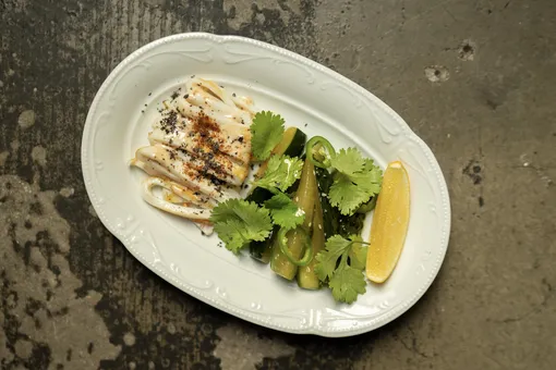 Тунца с авокадо заправляют дрессингом на основе понзу-юдзу и комплектуют пряной эмульсией из домашнего айоли на основе бородинского хлеба. Цветная капуста маринуется в масле бер-нуазет, затем отправляется в сувид, чтобы поттм ее обжарили до корочки и заправили желтком, овечьим сыром и пеной из лесных грибов. Филе командорского кальмара (на фото) в чесноке и чили обжаривают на гриле и гарнируют битыми огурцами, ореховым соусом и лимоном.