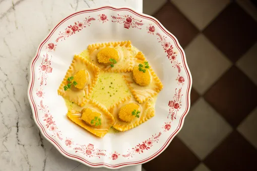 Не забыли и о любимых классиках: сельдь под шубой подают крупными кусками с хрустящим луком и сладковатой свеклой в глубокой тарелке — с узнаваемой, но обновленной подачей. Куриный шницель с чесноком и розмарином стал основой для салата «Цезарь». Никакого поиска курицы в зелени: она здесь главная. За партию рыбы отвечает обжаренный судакс овощами и соусом из белого вина, а также янтарная форель с шафрановым ризотто миланезе. Завершает меню тосканский суп каччукко — плотный, насыщенный говяжий бульон с томатами, соусом биск и щедрой порцией морепродуктов, напоминающий по консистенции гуляш. К нему подают хрустящий хлеб, и он там очень кстати.