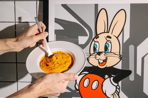 В «Доме Культур» (Москва, Большой Сухаревский пер. 25с1) до 9 февраля действует специальное меню, созданное в диалоге с выставкой художника Евгения Чеса «Срываем маски». Его работы — ироничная мультивселенная, где западные поп-культурные персонажи превращаются в героев советских мультфильмов: Гомер Симпсон становится львенком из детства, а дятел Вуди — Кешей, мечтающим улететь на Таити. Этот образный язык, основанный на ностальгии, узнаваемых кодах и игривой переосмысленности, лег в основу гастрономического спешла.