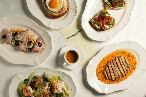 Среди других фирменных блюд — шакшука с соусом тахини, кинзой и лепешкой роти; скрэмбл в виде розы с томатом, тапенадом и мортаделлой; каша из зеленой гречки на кокосовом молоке с малиной и ванильным кремом; сырники с вишневым конфи; брускетта «Вителло Тоннато» с яйцом пашот и бриошь с тартаром из говядины и свежей бурратой. Информация для сонь — часть позиций можно заказать в формате позднего завтрака до 16:00.