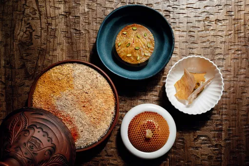 Десертная карта теперь включает шесть композиций, вдохновлённых путешествиями по Африке. Среди них — «Мильфей из кофе с кардамоном» с хрустящими шоколадными коржами, кофейным пралине и мороженым; «Пудинг Мальва» с лимонно-абрикосовым конфи и специями, подаваемый в винтажном тажине; банановое мороженое с финиковым конфи и шафраном; медовик на гречишном мёду с малиной и сотами; а также йогуртовый десерт с цитрусом, фисташкой и бергамотом.