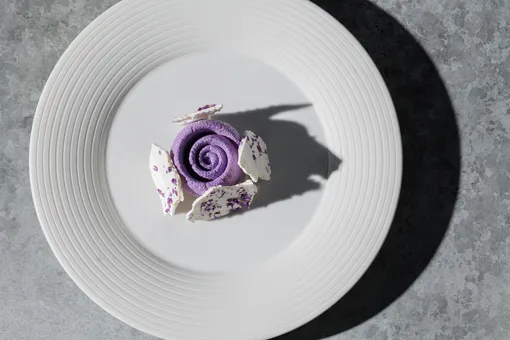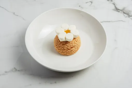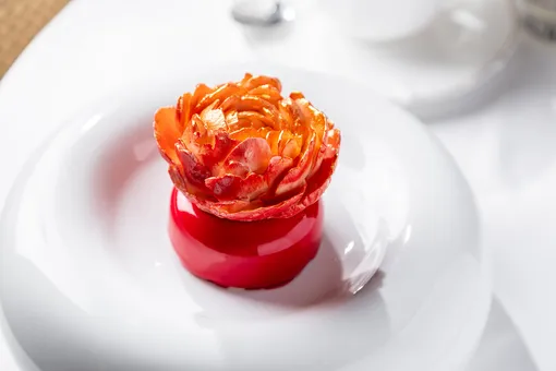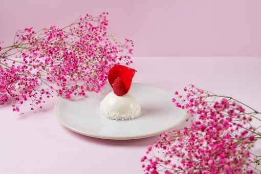 Возвращаемся в столицу — в праздничный день в ресторане Garda (Москва, Петровка 17с1) подают лимитированный десерт в форме распускающегося бутона. Основа выполнена из хрустящего печенья дакуаз на основе миндальной муки, а венчает мусс из клубники и сливок зефирная роза с тягучей сердцевиной.