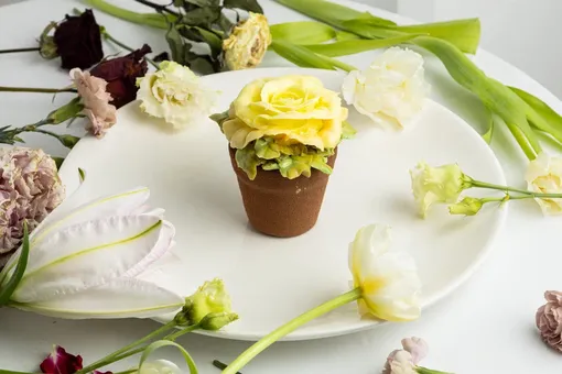 Ресторан «Восход» (Москва, Варварка 6с7, парк «Зарядье») 8 марта планирует угощать представительниц прекрасного пола десертом в виде очень правдоподобного розового бутона из крема в тирамису-горшке. Такая роза аппетитно пахнет ванилью.