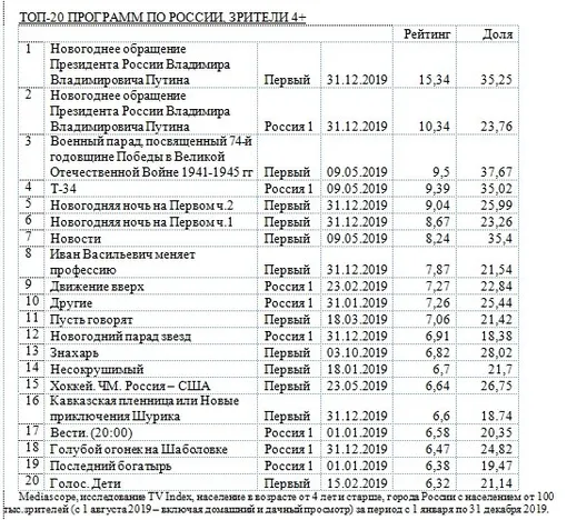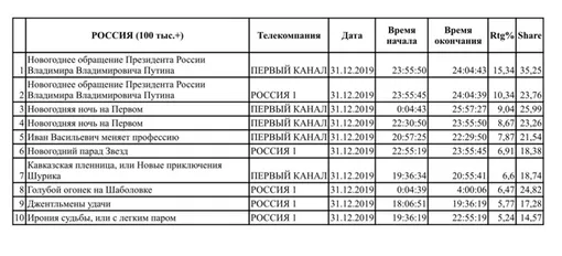 9 января компания Mediascope предоставила рейтинговые данные по телепрограммам, ставшим лидерами новогодней ночи и 2019 года в целом. Новый год российские зрители встретили с Первым каналом, обеспечив ему уверенное преимущество по итогам 31 декабря. Вне конкуренции Новогоднее обращение Президента страны, главным праздничным шоу стали обе части Новогодней ночи на Первом, а самым популярным фильмом – комедия «Иван Васильевич меняет профессию».