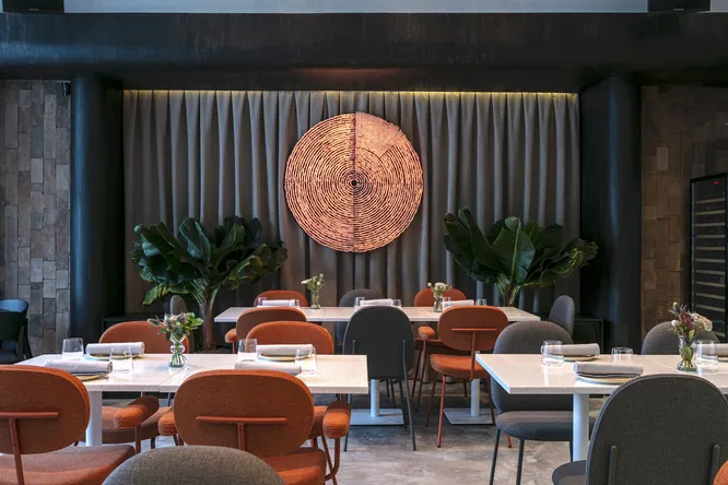 Интерьер GIGI разработан командой Милы Титовой MT.A: Architecture и воплощает собой светлое пространство на 50 посадочных мест, наполненное воздухом и яркими цветовыми элементами. Длинная барная стойка притягивает взгляд своим рельефом, а яркий световой круг является сердцем ресторана и живет в ритме GIGI: днем он источает теплый свет, а вечером пульсирует неоновыми оттенками.