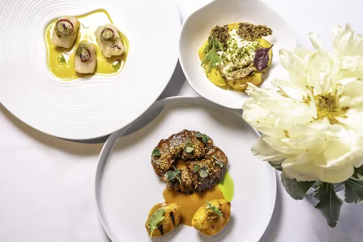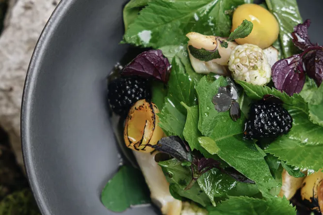 Первое блюдо — мусс из печени утки и цыпленка с черемуховым желе, клубникой и дикими травами. Второй курс — салат из дикоросов Смоленской области с томленым трубачом и свежими ягодами. Третий — стейк арктического гольца из Мурманской области с подмосковной спаржей, редисом и березовой комбучей.