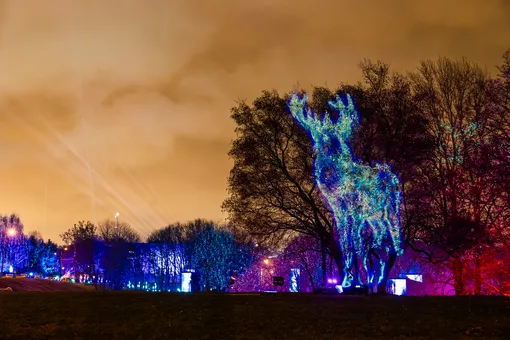 Каждый день гостей площадки ждет световое шоу: в центре площадки по-новому «зажжётся» и легендарный костёр. Теперь эта инсталляция, выполненная в художественном стиле, станет частью световой постановки, соединяя историю Дворца пионеров с современной городской культурой. А в парковой зоне гости смогут увидеть северное сияние и встретить животных, которые будто появляются среди деревьев и кустов.