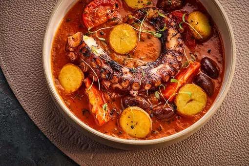 Один из самых заманчивых разделов – American Corner. Тут можно встретить бургер из мраморной говядины на сливочной бриоши с сыром бри, трюфельным соусом и вишней (1150 руб.), хот-дог с марокканским осьминогом и гарниром из кукурузы в темпуре (1350 руб.) или хрустящие тако с креветками и манговым айоли(650 руб.).