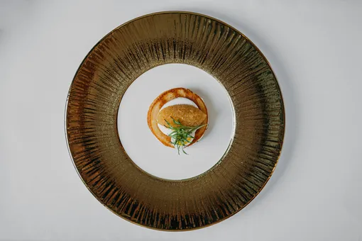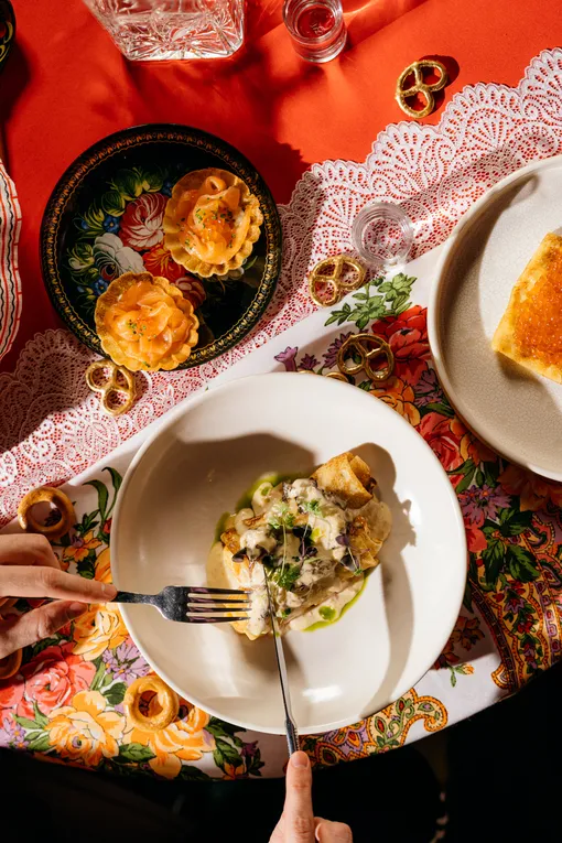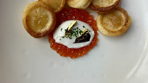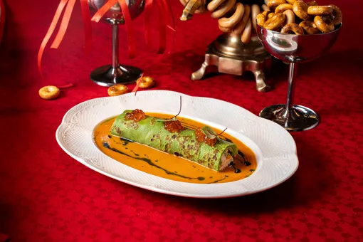 В меню — мини-оладьи с красной икрой, сметаной, луком и сусальным золотом; блины с вяленым пармским окороком и бураттой, где всё не просто так — луковая пудра символизирует сожженную Масленицу, а сыр подчеркивает важность молочных традиций праздника.