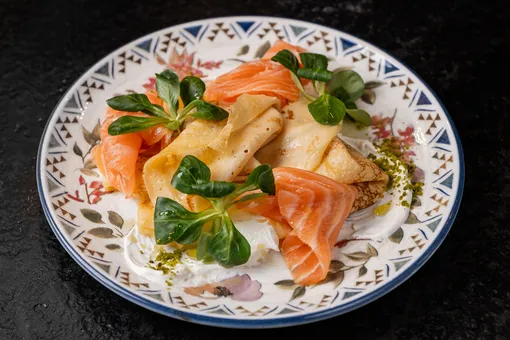 Среди рыбных вариантов — шпинатные блины с креветками и крабом под соусом биск, украшенные икрой тобико, кимчи-соусом и кресс-салатом; пшеничные блины с подкопченной треской, копченой сметаной, огуречным тартаром и укропным маслом, посыпанные пылью из черной четверговой соли; а также классический вариант с лососем и сливочным сыром.