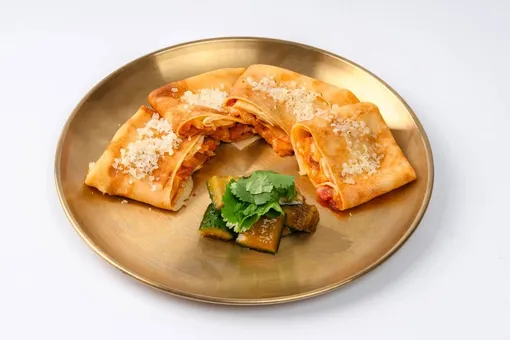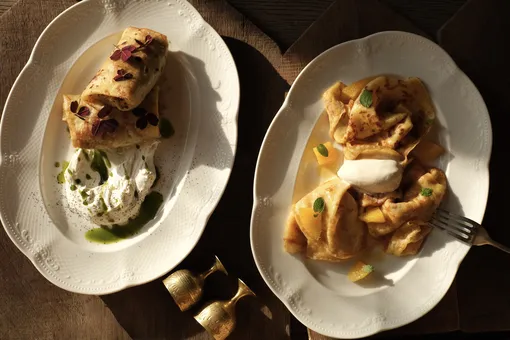 В меню пять авторских начинок: с белыми грибами и миндальной рикоттой; красной икрой и греческим йогуртом; тартаром из лосося и цитрусовым кремом; индейкой су-вид и соусом из рикотты; а также десертный креп сюзет с цитрусовым соусом, ванильным мороженым, фисташкой и мятой.
