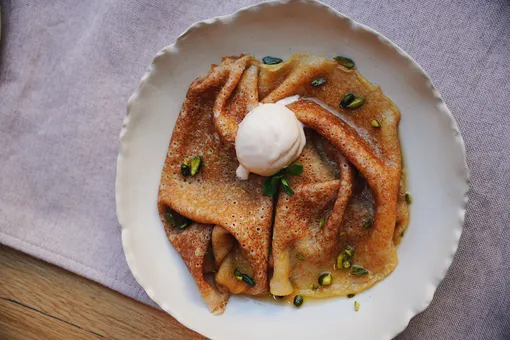 Гости могут взять простые блинчики и дополнить их на выбор — например, креветками, фетой или ферментированной капустой. Особое внимание — блинному торту «фисташка-матча»: матча-блины, фисташковый крем, малиновый соус и хрустящая начинка из фисташковой пасты и катаифи. Блюдо без глютена и рафинированного сахара.