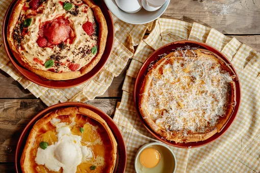 Ресторан № 13 предлагает воздушные блины-конверты с вишневым конфи, сливочным кремом, шоколадом и крамблом. Среди сытных вариантов — пастрами с сулугуни и пармезаном, лосось с креметтой, авокадо и огурцом.
