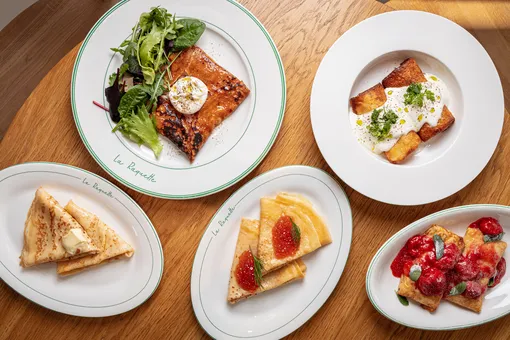 В бистро La Raquette Масленицу отмечают особенным меню с бретонской галетой с мортаделлой, моцареллой и яйцом пашот, блинами с мясом и копченой сметаной, а также сладкими блинами с творогом и клубничным компоте. Конечно, есть и блины с красной икрой — куда без этого символа праздника.