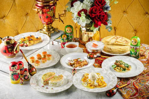 Команда ресторана Аркадия Новикова «Недальний Восток» приглашает гостей разделить масленичную неделю в атмосфере уютных совместных дней. Специально к этому событию разработано несколько сетов, объединяющих русские и восточные ритуалы традиционного застолья. В меню — три формата блинов. Классические подаются с добавками на выбор: слабосоленая семга, сметана, сгущенное молоко, варенье в ассортименте или мед. Для компаний предусмотрены два сета. «Сытный» включает 10 блинов и разнообразные закуски: сливочное масло с красной икрой, куриный паштет с луком фри и гранатом, слабосоленую семгу, сметану, израильскую закуску на основе сметаны и тахины с лимонным соком и фалафелем, крем-сыр лабне, рваную говядину, маринованные перцы и ветчину из индейки. «Сладкий сет» подойдет для всех, кто предпочитает десертное исполнение. Блины дополняют сметаной, сгущенным молоком, шоколадной пастой, кунжутной пастой тахина, несколькими видами меда и ассорти варенья. Украшают блюдо свежие ягоды — малина, клубника, ежевика, голубика, тайское манго и киви. Все позиции сервируют на больших медных подносах — по главным правилам восточного гостеприимства.