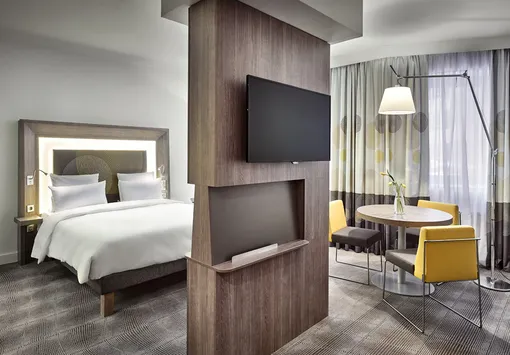 Современный дизайн Novotel Москва Киевская с лаконичными структурами – это сочетание изысканности и простоты, элегантности и геометрических форм. Динамичные цвета уходят на второй план, уступив место мягким оттенкам и нейтральным полутонам – бежевый, серый, коричневый. Оригинальные акценты в виде подсвечиваемой спинки кровати и ярких элементов в виде стульев и диванов добавляют функциональность и стиль.
