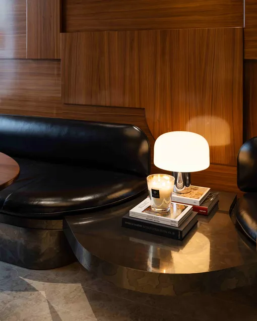 Основатели проекта Диана Даниели и Мишель Левиев вдохновлялись эстетикой 1970-х годов, сочетая элементы советского модернизма с современными трендами. Интерьер бистро украшают настенные панели из ореха, металлическая барная стойка, кожаные диваны и кресло из черной норки. Округлые формы и приятные фактуры создают атмосферу уюта. Особая гордость пространства — мебель и предметы декора собственного производства.