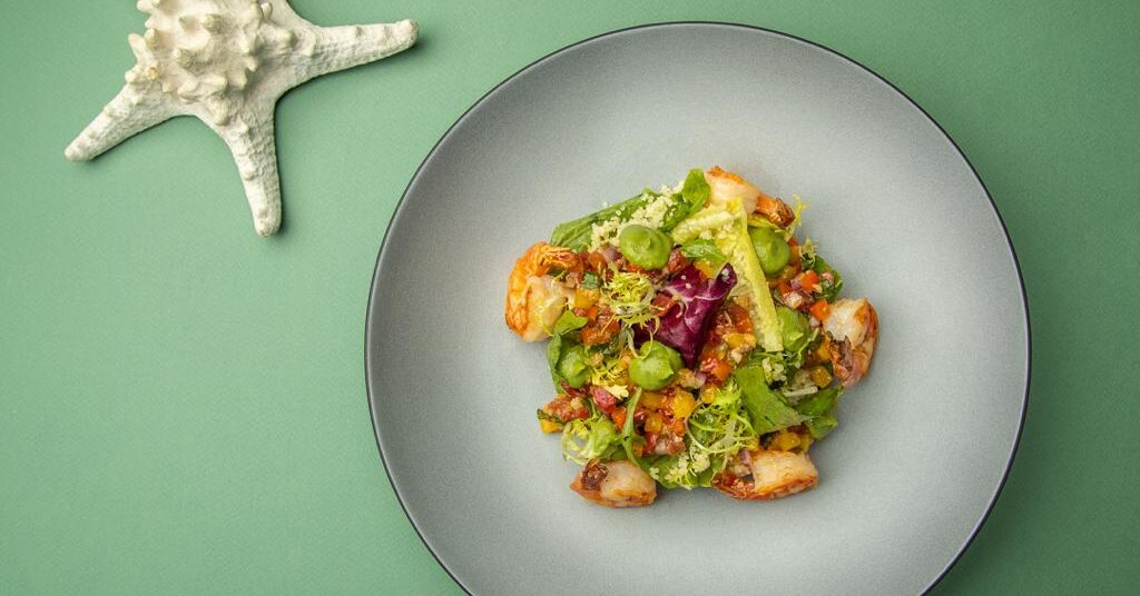 Сочетание гуакамоле, кус-куса, креветок на гриле и свежего салата – идеальное сбалансированное блюдо для всех, кто следит за своим питанием.