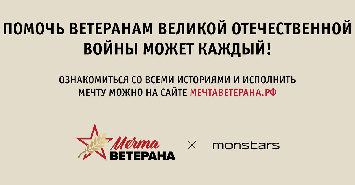 Агентство Monstars поддержало благотворительный проект «Мечта ветерана», главная цель которого — узнать несбывшиеся мечты ветеранов, а после помочь их осуществить совместными усилиями. Ветераны подарили людям мирное небо над головой, и очень важно, чтобы их вспоминали не только в праздничные даты. Агентство Monstars вместе с лидерами мнений Monstars People решили рассказать о проекте и сделать всё, чтобы о нём узнало как можно больше людей.