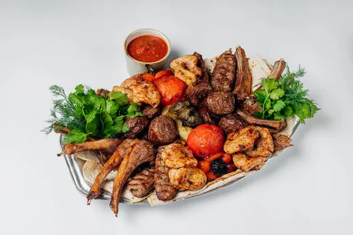 Полностью халяльное меню от ресторана «Высота 5642» на Большой Якиманке превратит праздник в щедрое застолье. Рекомендуем начать с холодца из отборного мяса и традиционного «Оливье» с говядиной со свежими и солеными огурцами и слабосоленой сельди под шубой. Лопатка ягненка в медово-горчичной глазури с козьим сыром и кролик, запеченный на углях в грузинской аджике, станут настоящим украшением стола, а большое ассорти блюд на углях с бараньей корейкой, шашлыком из мякоти ягненка, цыпленком на углях, запеченными овощами и заготовками для разнообразных люля отлично подойдут для того, чтобы отметить главный зимний праздник за городом.
