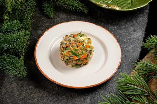 Restaurant N°13, где в каждом блюде гастрономия — это искусство, подготовил меню в духе званых вечеров. Для новогодней доставки предлагают сразу два вида «Оливье» — с крабом и говяжьим языком. Не забыв, конечно, и о сельди под шубой. На горячее гостям будет непросто выбрать между цыпленком под соусом бермонте с черным трюфелем, мясным пирогом «Патэ-ан-крут» и запеченной бараньей шеей с соусом демиглас, а также картофельным гратеном с сыром «Грана Падано». А ростбиф-стриплойн, лосось «Гравлакс» слабой соли и говядину «Веллингтон» гости еще долго будут вспоминать как лучшее гастрономическое начало года. Идеальными десертами станут яблочный пирог, «Павлова» и набор «Мадлен».