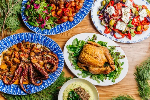 Для тематического праздника The Greeks готовят щедрую порцию греческого салата с карамелизированными оливками, нежную лопатку ягненка с картофелем и домашним лечо и ароматного запеченного цыпленка в пряностях с картофельным пюре, трюфельным маслом и гранатом. Отдельным украшением стола станет целый осьминог по-гречески.