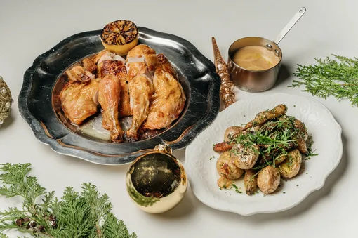 Впервые блюда на новогодний стол можно заказать из Patriki cafe. Запеченные фаланги камчатского краба с соусом из трех видов икры , три вида «Оливье» на любой вкус — с крабом, лососем и окороком — и сельдь под шубой с красной икрой от Виталия Истомина и Артема Лосева станут украшением любого стола. Для завершения вечера или праздничного завтрака 1 января подойдет яблочный пирог с корицей и кремом пломбир.