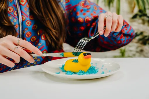 Ресторан «Восход» и корейский бренд BAFI поддерживают летнее настроение: мороженое с карамелью и шоколадом от шеф-кондитера Ольги Рыбаковой имеет форму желтой яркой уточки в солнцезащитных очках и брызгах воды. Вместе с десертом каждый гость получает в подарок резиновую уточку от бренда. Москва, Варварка 6с7, парк «Зарядье».