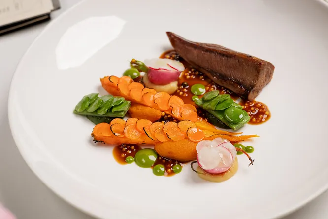 Ризотто с лангустинами приобрело жизнерадостный характер благодаря ярко-зеленому соусу из шпината и петрушки, дополненному тартаром из сладких томатов. Говяжьи щечки шеф томит в собственном соку с карамелизованным абрикосом и картофелем в чесночном масле, а нежную треску обжаривает до хрустящей корочки — и подает на морковном креме с жареным зеленым луком и классическим лимонным бербланом.