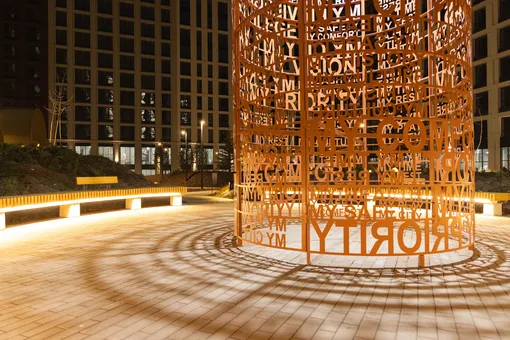 На территории более 1,6 га создан приватный двор с ландшафтным дизайном, яблоневым садом и зонами отдыха. Установлены амфитеатр, сухой фонтан, игровой комплекс «Башни» и другие объекты. Внутри предусмотрены фитнес-центр с бассейном, SPA, супермаркет, кафе и подземный паркинг с зарядными станциями для электромобилей.