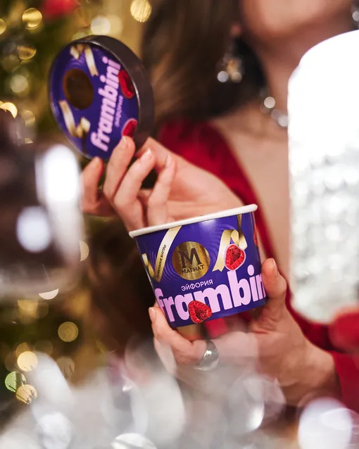 Специально к релизу бренды придумали кое-что еще: в часть упаковок десерта спрятана съедобная золотая малина. Найдя ее и отправив фото через QR‑код на вкладыше, каждый счастливчик получит запас десертов — две коробки малины в шоколаде Frambini и две коробки эскимо «Эйфория Маскарпоне Голубика» от «Магнат».