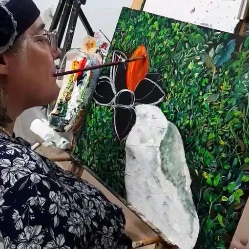 Несмотря на то что ее руки практически не двигаются, женщина не оставила творчество, только кисть или карандаш она теперь держит во рту.