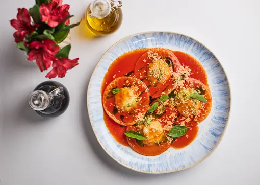 Трюфель также украшает равиоли с рикоттой. Тесто для пасты готовят по старинным рецептам из твердых сортов муки, а нежная сырная начинка дополнена насыщенным ароматом черного трюфеля.