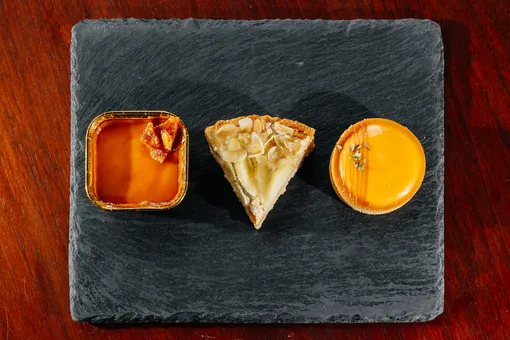 Среди десертов появились тарт с инжиром и бисквитный пирог с начинкой из бобов тонка. Осенние акценты расставлены яркими мини-эклерами с облепиховым кремом и эффектной сферой из изомальта с молочной мельбой и инжирным соусом.