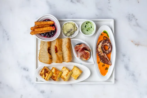 Испанский сет включает семь позиций: осьминог с соусом ромеско, тортилью patatas, хлеб с маслом и зеленым чили, одну из закусок на выбор — парму с инжиром или салат с нутом и цукини, а также зеленый йогурт и чуррос со смородиной или шоколадной пастой.