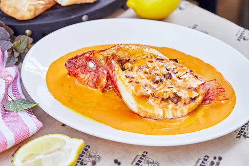 Особое внимание бренд-шеф рекомендует уделить разделу с рыбой и морепродуктами. В нем появились: рыба-попугай, фаршированная припущенным шпинатом с чесноком, с соусом карри, мидиями и вонголе (700 р./ 100 гр.); запеченная барабулька, фаршированная кальмаром и шампиньонами, подается под соусом буридо с кервелем (750 р./ 100 гр.); редкий деликатес — морской язык (550 р./ 100 гр.). Еще одна интересная новинка — морской окунь (560 р./ 100 гр.), которого подают с ароматным рататуем. Точно стоит уделить внимание бурриде по-провански с треской, голубым крабом, мидиями и крутонами (1390 р.); и кокоту с морепродуктами и голубым крабом, куда добавляют чилимские креветки, мидии, филе окуня в томатной сальсе с чесноком и тимьяном (1450 р.).