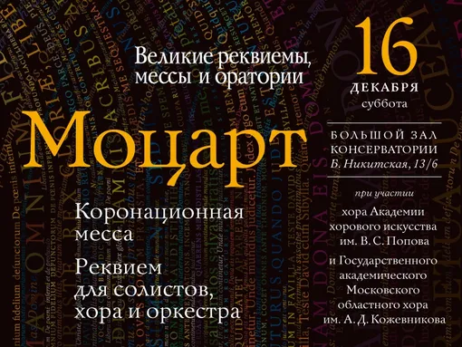 Божественную программу в 19:00 откроет «Коронационная месса», которая принадлежит к числу так называемых высоких служб – вид торжественных месс, исполняемых по большим праздникам, иногда связанных со светскими торжествами. Она была написана в Зальцбурге в 1779 году и получила свое название благодаря тому, что использовалась, в том числе и для коронации высочайших особ.